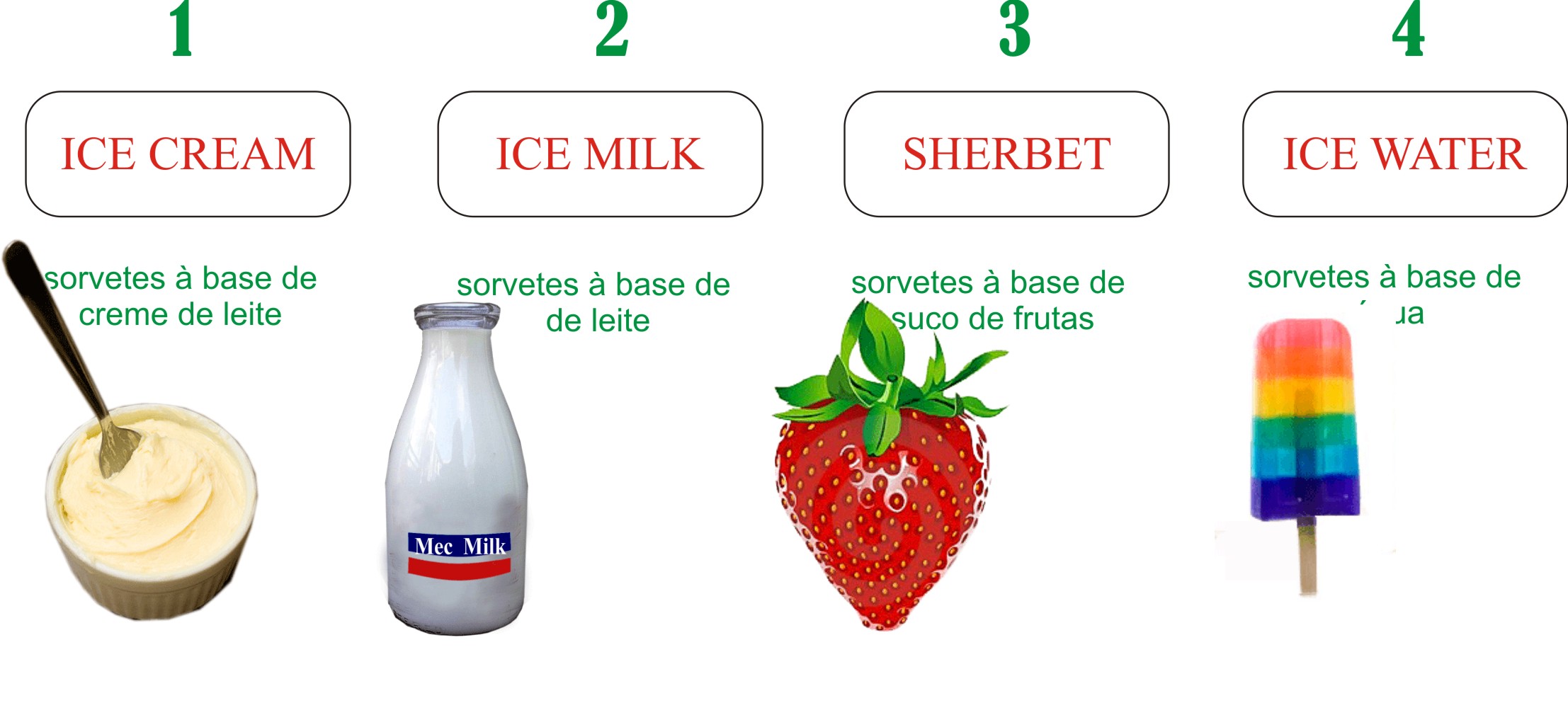 Basicamente os tipos de sorvete são quatro: Sorvete de Creme de Leite, Sorvete de Leite, Sorvete de Frutas e Sorvete de Água aromatizada e colorida.